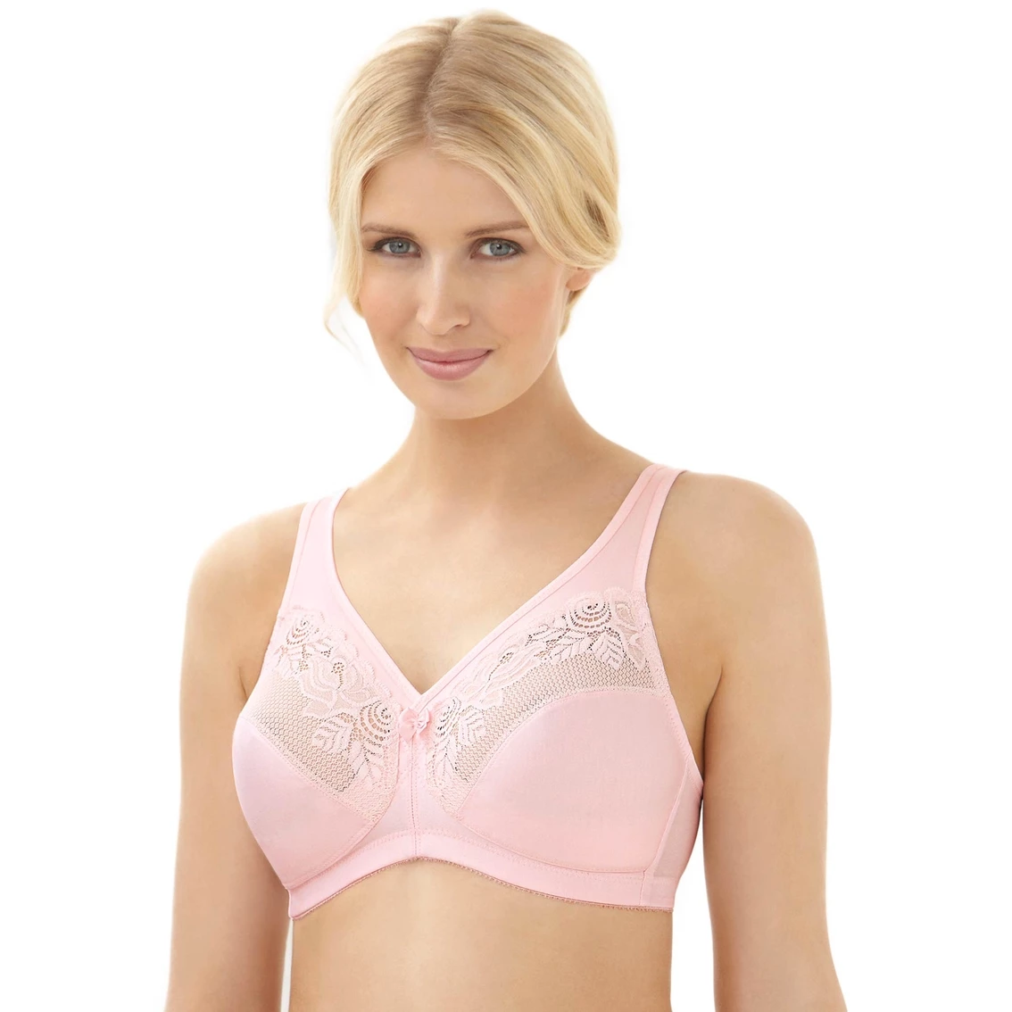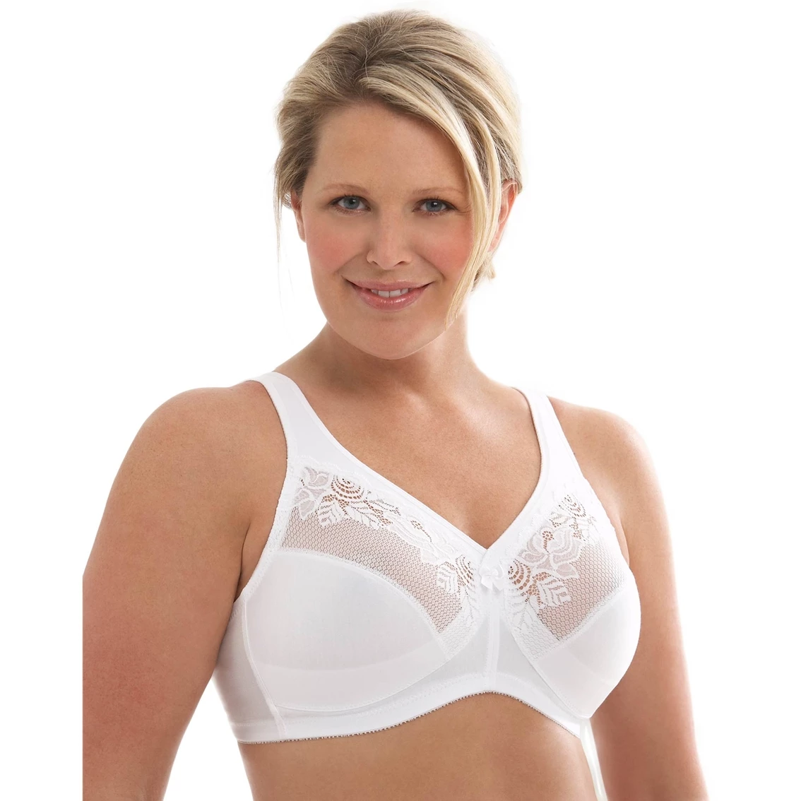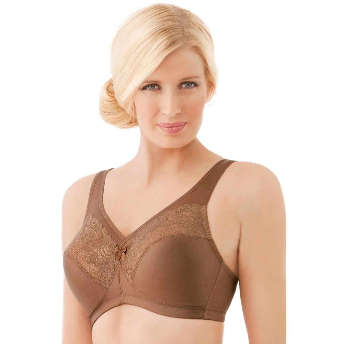 Your clothes will fit and look better with the Magic Lift Minimizer Bra from Glamorise smoothing your silhouette. The sophisticated, lacey look includes all of the Magic Lift features Glamorise is known for. For instance, a wireless, inner-cushioned band for incredible bust support and great shape; padded straps that pamper your shoulders; and cotton-blend, bottom cups that wick away moisture and offer all day comfort. Style: 1003.