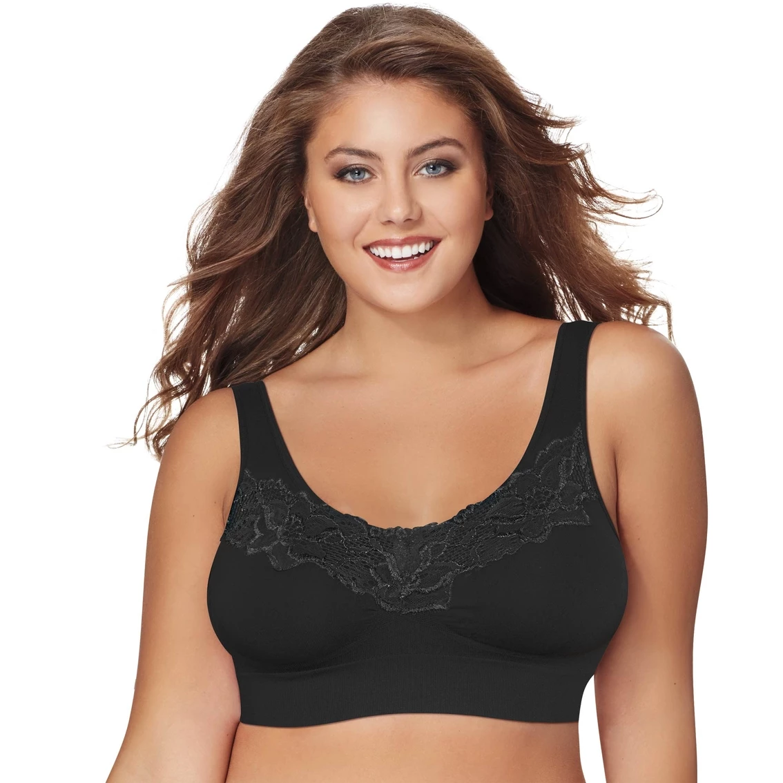 This pure comfort lace bra from Just My Size features flex-to-fit comfort in six sizes. The seamless knit-in support under and around the breasts delivers flawless shape, and the beautiful lace detailing around the neckline adds some extra style. There are wide straps and a wide rounded back for all-around smoothing. The comfort-back is close for adjustability, and the wide bottom band prevents roll-up. Style: 1271.
