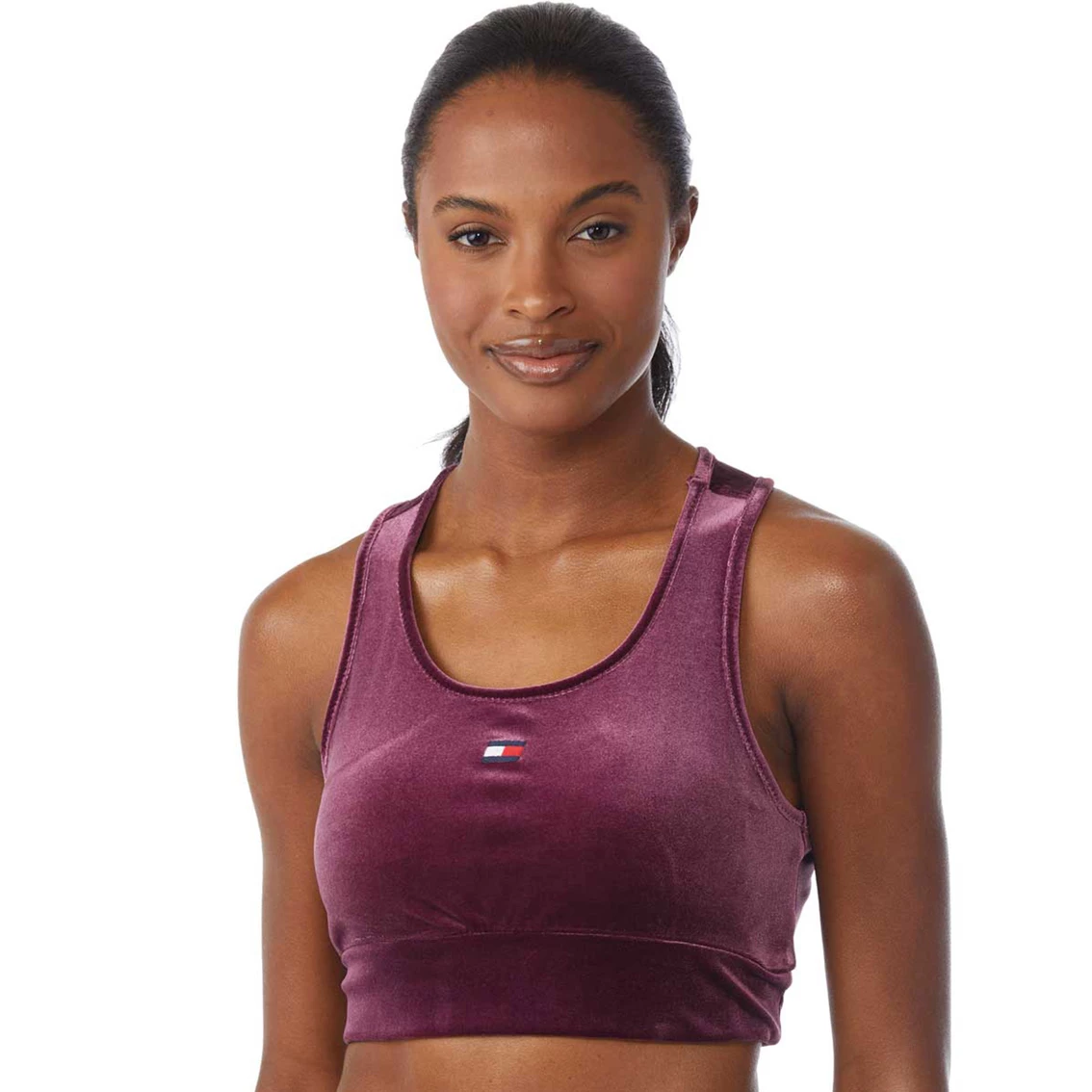 This Tommy Hilfiger Sport long line velveteen bra has removeable cups, embroidered logo detail, a global stripe tab. It can be worn alone or layered. Style: TP2T0551.