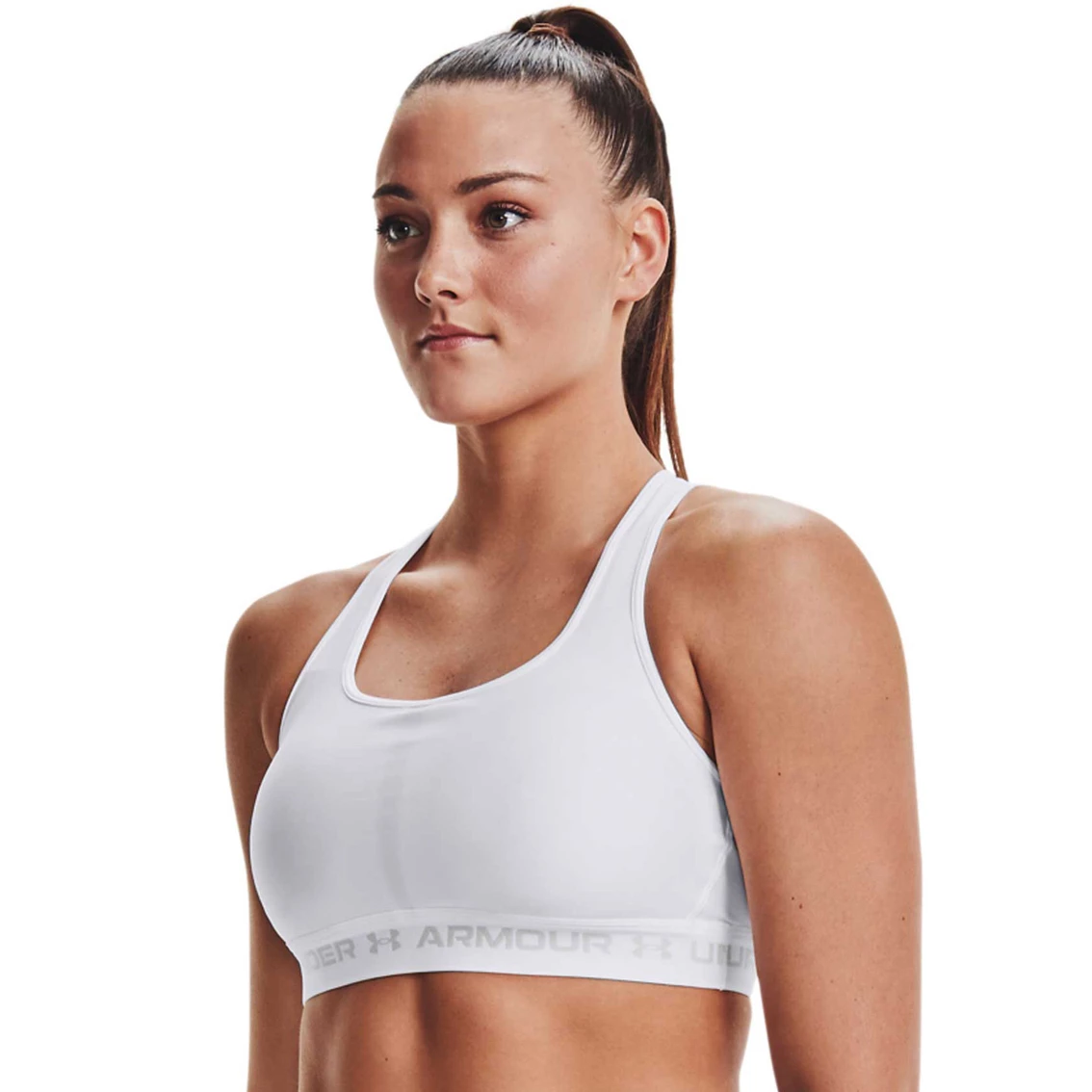 The Under Armour Crossback Mid Sports Bra delivers strategic support that is tailored for medium-support activities like cycling, weight training and boxing. Soft, quick-drying cups provide extra structure and coverage with perforations for added breathability. Removable cups have helpful R and L arrows to easily put back in. Crossover straps with updated keyhole detail provide for easier on/off. The updated interior construction helps keep pads in place during wear and wash. The elastic band feels super smooth and soft. The material wicks sweat and dries really fast and light. The super-smooth, double-layer HeatGear fabric delivers superior next-to-skin feel. 87% Polyester/13% Elastane. Style: 1361034.