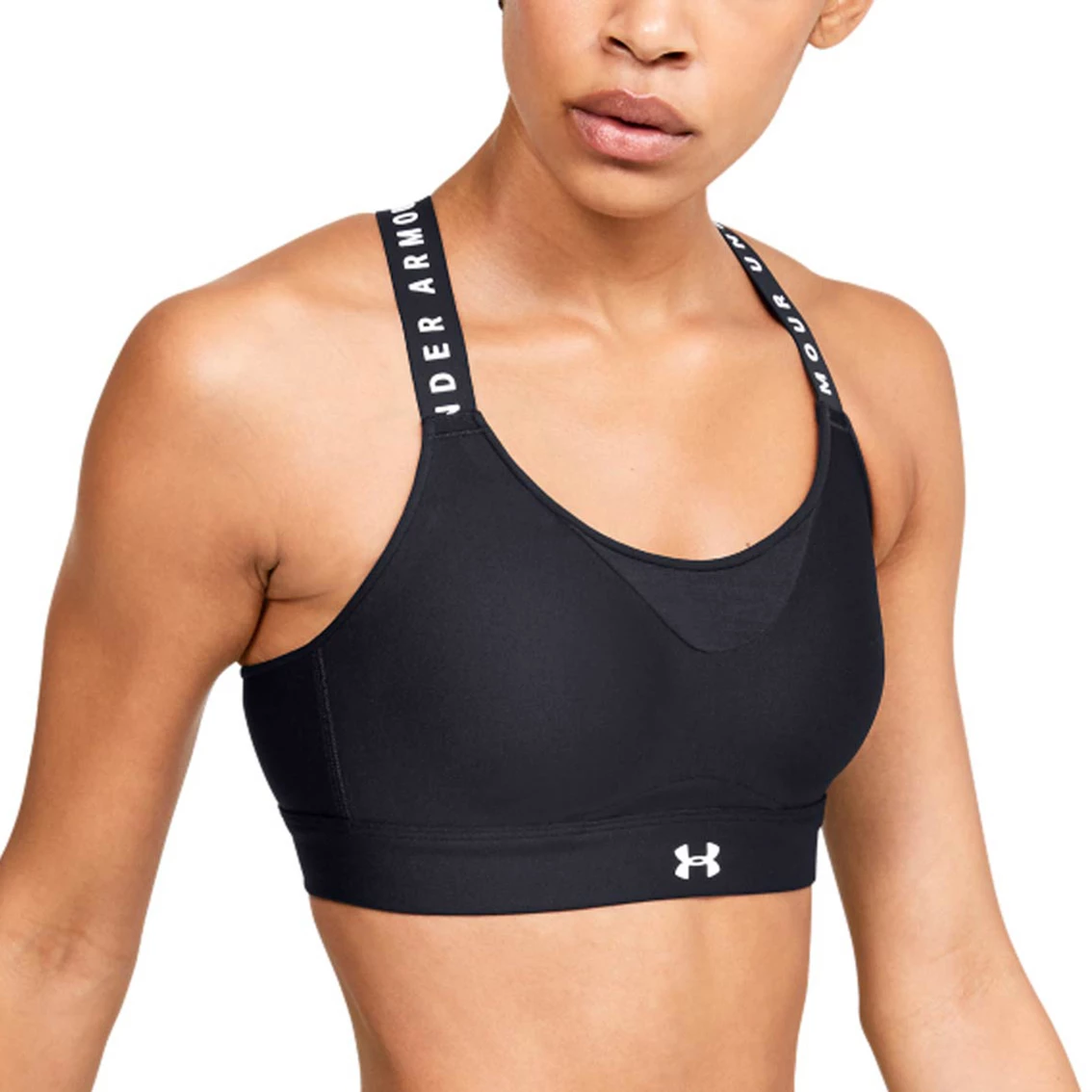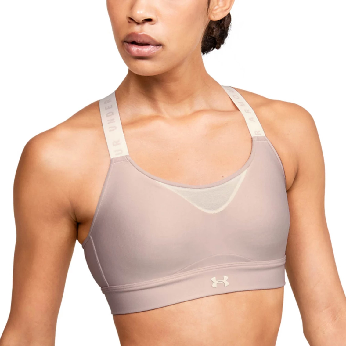 The Under Armour Infinity High Sports Bra delivers strategic support, tailored for high-support activities like running, court sports, field sports and aerobics. Molded, PU injected one-piece padding for ultimate comfort and added coverage. Mesh panels for added breathability. Smooth, sweat-wicking band has easy hook and eye closure for easy on and off. Adjustable criss-cross straps with wordmark detail for a custom fit. HeatGear fabric delivers superior next-to-skin feel. Material wicks sweat and dries really fast.