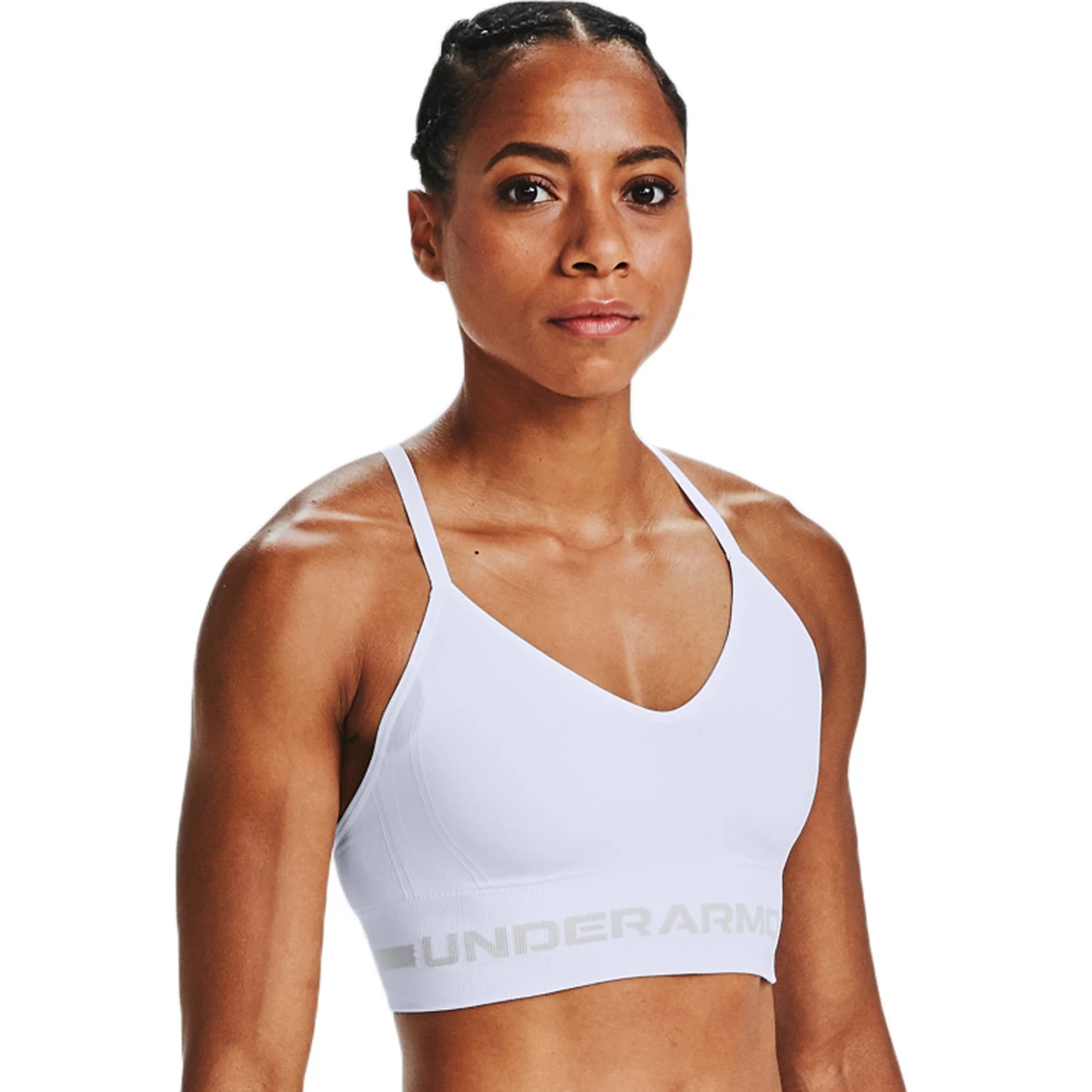 Delivers strategic support, tailored for low-impact activities like yoga, pilates & hiking. UA Seamless is a soft knit with engineered ventilation, mapped to the places you need it most. Soft, removable cups for enhanced shape & coverage. Skinny strap pullover with adjustable cross back design. Wide jacquard wordmark band for amazing stretch & comfort. Material wicks sweat & dries really fast. 4-way stretch construction moves better in every direction.