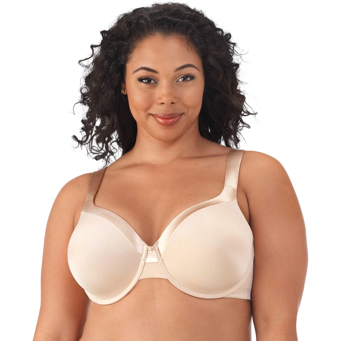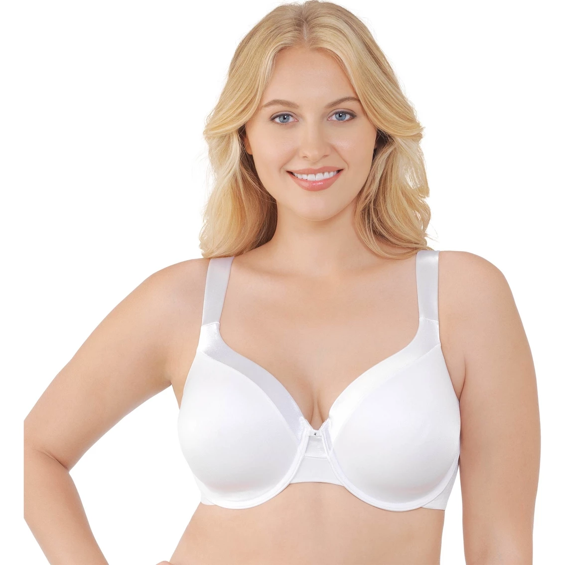 Vanity Fair Illumination Zoned-In Support Full Figure Underwire bra offers all day support and a fit for your everyday activity. Satin lining throughout interior is super soft against the body. Padded contoured cups and a no poke underwire provide the coverage that you need for all day comfort. The wider plush straps lay flat, adjust from the back and stay in place with the leotard back design. The smooth fabric on the back conceals the 3-row, metal coated hook-and-eye closure with 3-columns to adjust for your custom comfort level. Style: 76338.